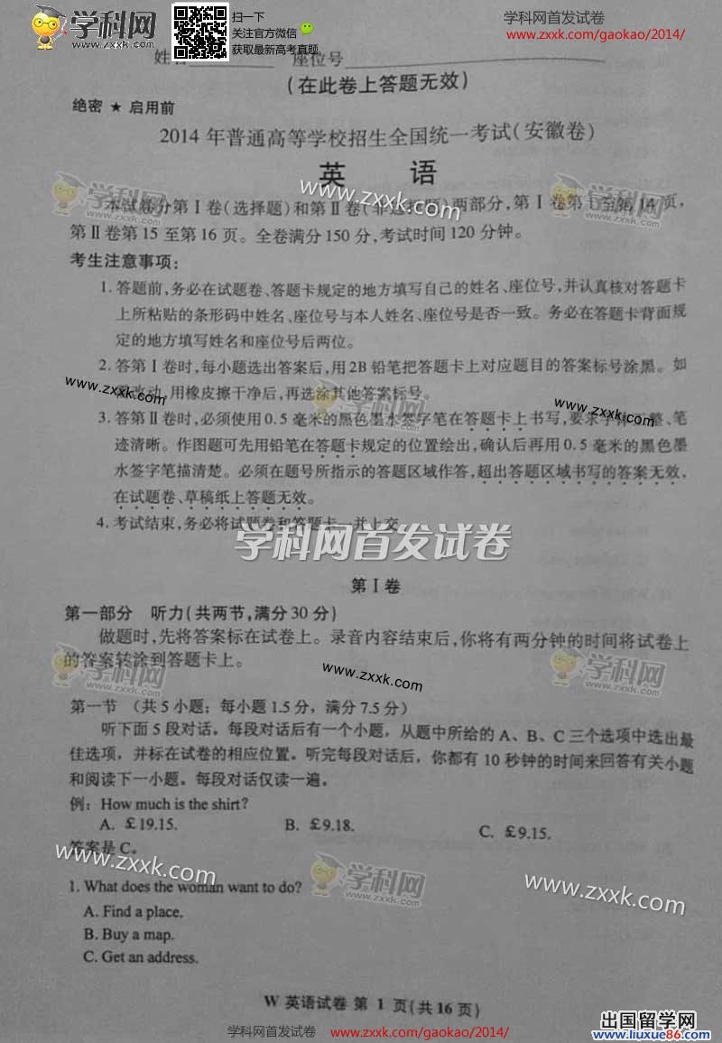 2014年的高考正在進行,相信此時的考生們正在考場里揮灑文墨,正懷抱著雄心壯志。出國留學網高考頻道會及時為廣大考生提供2014年安徽英語試題最新發(fā)布,考生們在考試的時候先不用查探,應該將主要注意力放在下一場考試上,等所有的考試結束,考生們再上來本頁面進行刷新核對考卷答案,預估出自己的分數。刷新請按ctrl+F5,出國留學網高考頻道現在這里預祝大家考出自己滿意的成績。