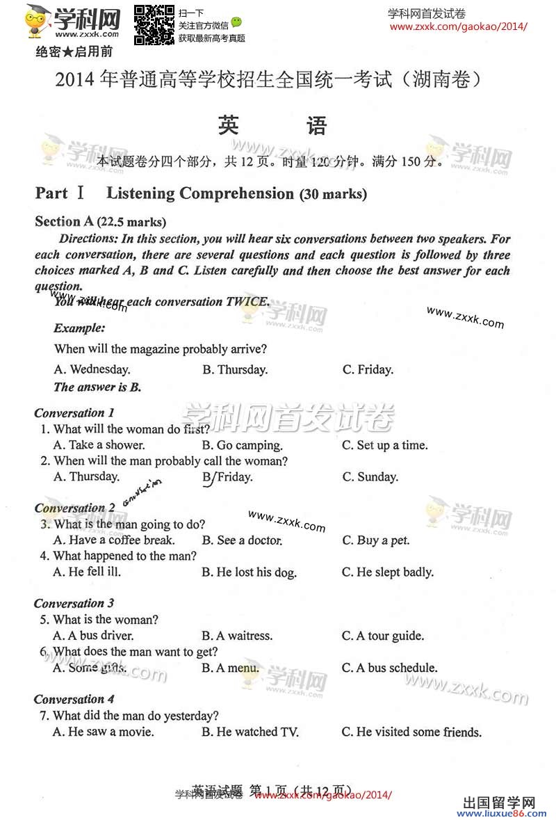 摘玫瑰,就要先折掉刺枝;想走坦途,就要斬除那些荊棘;想看到天明,就要勇敢闖夜寂;厚德載物,天道酬勤,小編先祝所有考生高考順利!2014年的北京高考真題會(huì)在考后發(fā)布,出國(guó)留學(xué)網(wǎng)高考頻道小編緊密關(guān)注2014年湖南高考英語(yǔ)真題及答案,試題一旦公布,將會(huì)第一時(shí)間在此頁(yè)面顯示。同時(shí)還有更多2014北京高考科目真題及答案會(huì)在考后的第一時(shí)間公布,建議您收藏本網(wǎng)站(ctrl+D收藏即可)。
