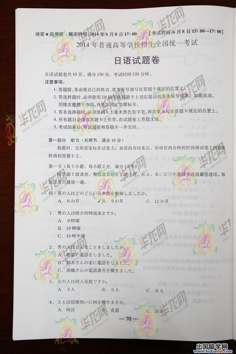 有人說高考給了每一個(gè)人一次重新投胎的機(jī)會,因?yàn)橥ㄟ^高考農(nóng)民的孩子可以出人頭地,普通人可以變?yōu)槭苋俗鹁吹闹R分子,似乎還是有那么點(diǎn)道理的,不管結(jié)局如何,你能做到的就是抓住這個(gè)機(jī)會,努力拼搏一把。轉(zhuǎn)眼就是2014年的高考,出國留學(xué)網(wǎng)高考頻道第一時(shí)間為您提供2014重慶高考日語真題及答案解析,希望廣大考生時(shí)時(shí)關(guān)注出國留學(xué)網(wǎng),以免錯過最新考試資訊。