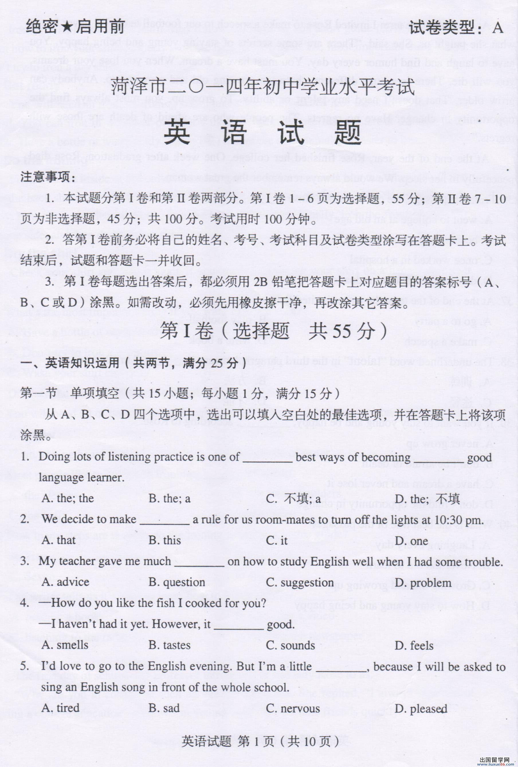 中考是一場沒有硝煙的戰(zhàn)爭,考生們正在考場上奮斗,相信大家從考場上退下來的時(shí)候一定很想最快知道自己的成果吧,但中考成績出來是需要一定時(shí)間的,所以大家可以先自己對照一下,出國留學(xué)網(wǎng)中考頻道會(huì)及時(shí)為廣大考生提供2014菏澤中考英語真題及答案,菏澤的考生們可以到本網(wǎng)站來下載對照答案,相信一定會(huì)對大家有所幫助,建議您收藏本網(wǎng)站(ctrl+D收藏即可)。