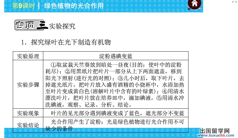 同學們復習《?綠?葉?在?光?下?制?造?有?機?物?》時要注意兩個重難點:①探究綠葉能否在光下制造淀粉。②確保實驗順利進行,對實驗的結(jié)果進行深入的分析。更多有關(guān)2014中考生物的信息可登錄出國留學網(wǎng)生物頻道,歡迎收藏本站(CTRL+D即可收藏)!