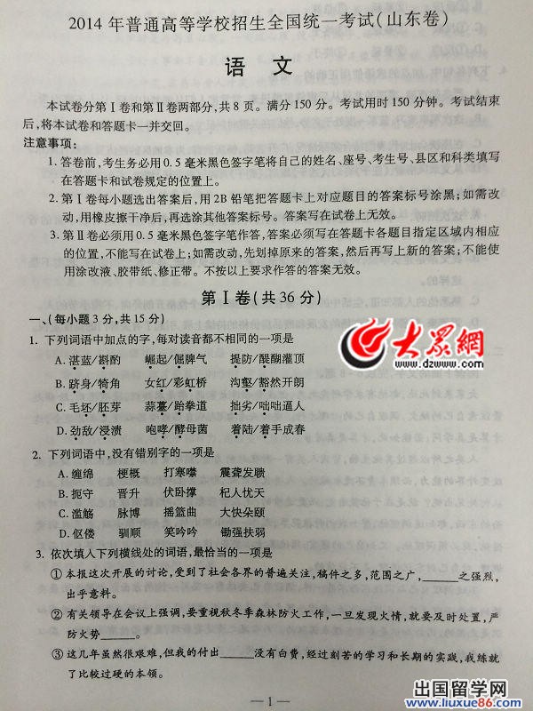 因?yàn)橛辛烁呖歼@個(gè)火熱的六月也成了各位考生心目中的黑色六月,不管怎樣,該面對(duì)的始終都要面對(duì),出國留學(xué)網(wǎng)高考頻道會(huì)及時(shí)為廣大考生提供2014年山東高考語文真題及答案,請(qǐng)家長與各位考生關(guān)注本站更新(ctrl+D收藏即可)。一旦2014山東高考真題及答案發(fā)布,將在此表頁的頭條顯示,如果您需要查找的真題及答案沒有顯示,請(qǐng)按ctrl+F5進(jìn)行刷新。