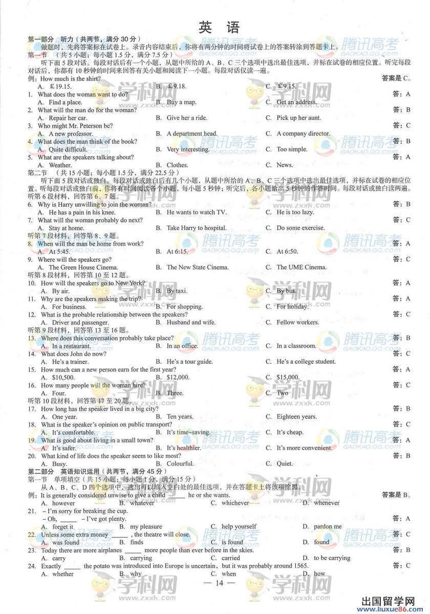 2014年的高考正在進(jìn)行中,同學(xué)們在考場里絞盡腦汁,我們在考場外殫精竭慮為您收集考試信息,出國留學(xué)網(wǎng)高考頻道第一時(shí)間為您提供2014廣西高考英語真題及答案解析,希望對(duì)您有所幫助,歡迎您訪問出國留學(xué)網(wǎng)瀏覽更多考試資訊,了解最新信息請(qǐng)按CTRL+F5刷新頁面。