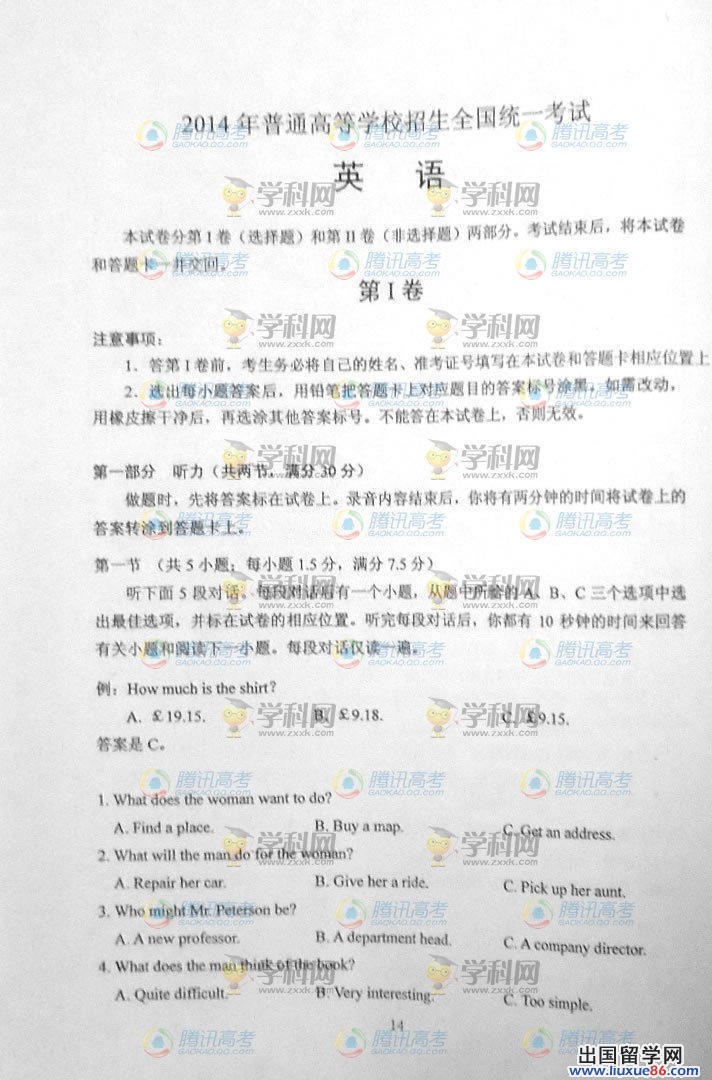 出國(guó)留學(xué)網(wǎng)高考頻道是專(zhuān)注于每年高考方方面面的專(zhuān)業(yè)頻道,您想找的所有與高考有關(guān)的本站都能提供。本網(wǎng)站在2014遼寧高考結(jié)束后,將會(huì)以最快的速度把2014年遼寧高考英語(yǔ)真題及答案最新發(fā)布呈現(xiàn)出來(lái),一旦高考真題及標(biāo)準(zhǔn)答案發(fā)布,將會(huì)第一時(shí)間在此頁(yè)面的頭條顯示,如果您需要查找的真題及答案沒(méi)有顯示,請(qǐng)按ctrl+F5進(jìn)行刷新。希望對(duì)大家有所幫助。
