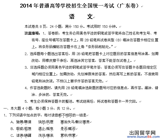 本文是由出國留學(xué)網(wǎng)高考頻道為大家搜集整理的2014廣東高考語文真題及答案,內(nèi)容來源于互聯(lián)網(wǎng),僅供大家參考借鑒。如果您有與2014高考真題相關(guān)的資料,歡迎您給我們投稿,與大家共同分享2014高考資訊,郵件請(qǐng)發(fā)送至tougao@liuxue86.com.期待大家的共同參與。