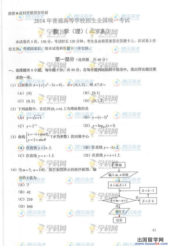 高考著實(shí)是一種豐收,它包蘊(yùn)著太多的內(nèi)涵。無(wú)論高考成績(jī)?nèi)绾?,你的成長(zhǎng)與成熟是任何人無(wú)法改變的事實(shí),這三年的辛勤走過(guò),你獲得的太多太多。出國(guó)留學(xué)網(wǎng)高考頻道會(huì)及時(shí)為廣大考生提供2014年北京高考數(shù)學(xué)真題及答案,同時(shí)接下來(lái)的幾個(gè)科目真題及答案亦會(huì)在此頻道顯示,請(qǐng)考試及家長(zhǎng)關(guān)注本站更新(ctrl+D收藏即可)。