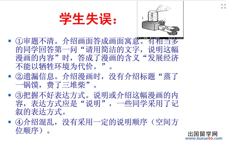 同學(xué)們復(fù)習(xí)中考語文時要重視復(fù)習(xí)方法,答題思路、方法和表述規(guī)范的指導(dǎo),務(wù)求答題簡捷,表述全面、準(zhǔn)確、清晰、規(guī)范,無疑是使學(xué)生少作無用功,少走彎路,避免無謂失分的關(guān)鍵。更多有關(guān)2014中考語文的信息可登錄出國留學(xué)網(wǎng)語文頻道,歡迎收藏本站(CTRL+D即可收藏)!