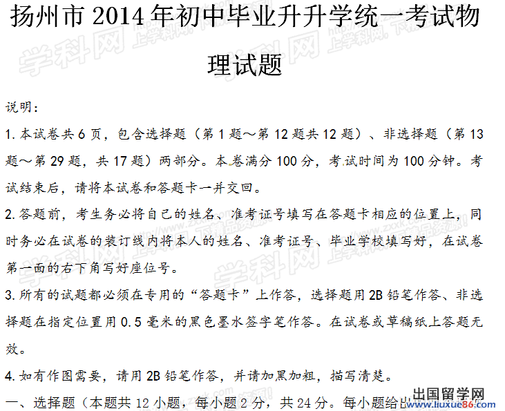 以下是出國留學網(wǎng)中考頻道為您提供的2014年揚州中考物理試題及答案,希望對您2014年中考有所幫助!