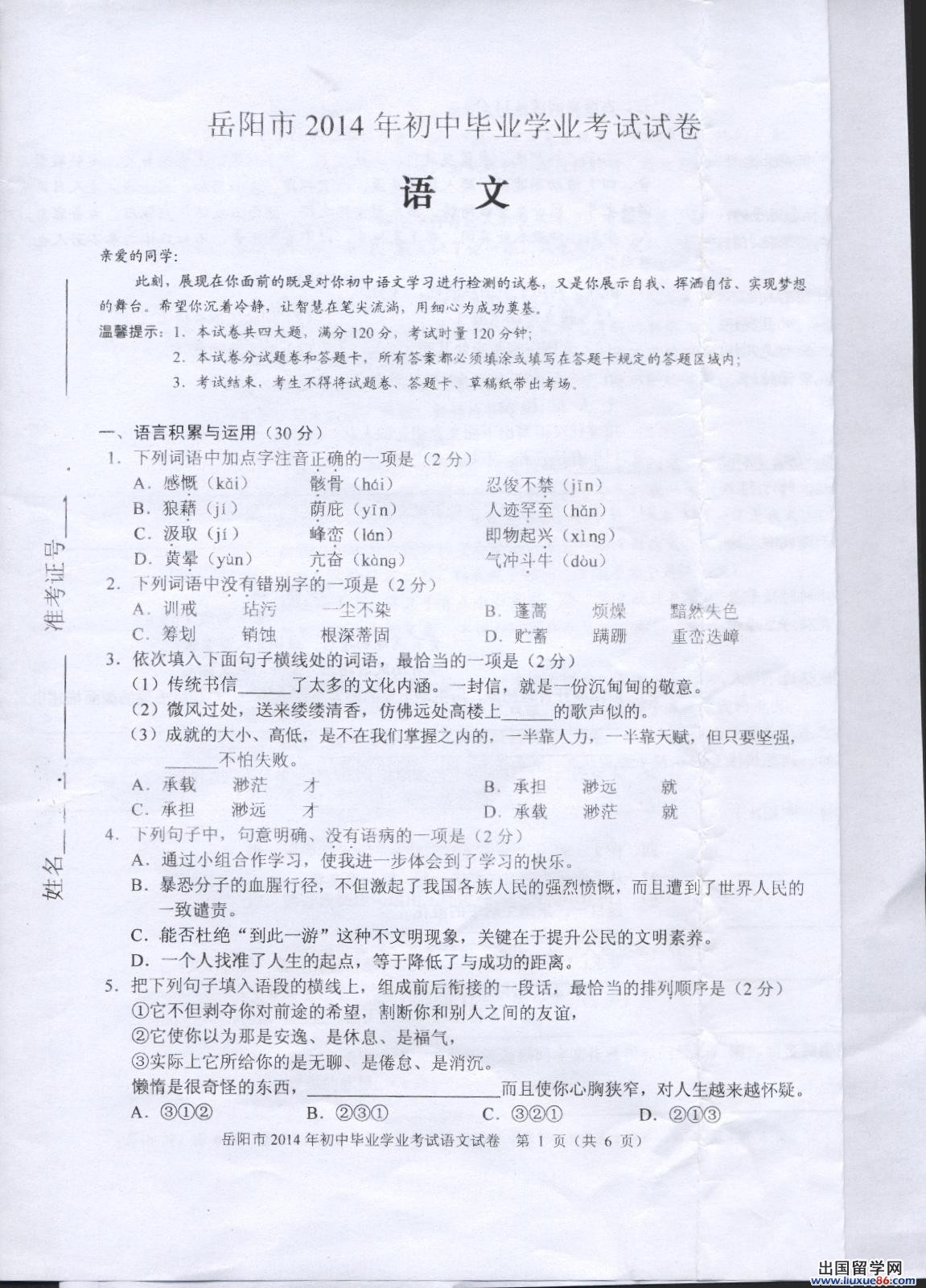 以下2014年湖南省岳陽中考語文真題及答案由出國留學(xué)網(wǎng)中考頻道為您提供,希望對您有所幫助!