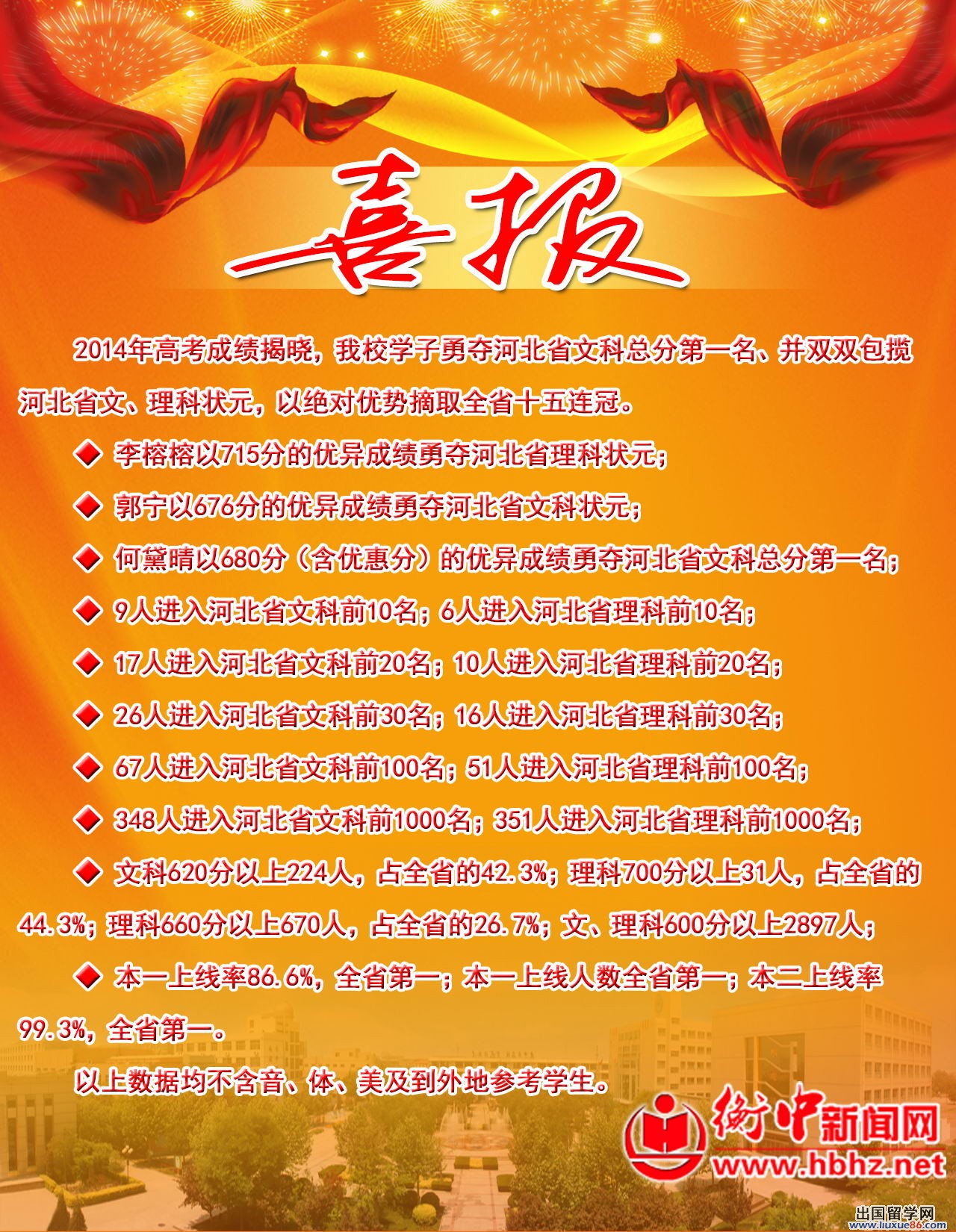 2014年高考成績揭曉,我校學(xué)子勇奪河北省文科總分第一名、并雙雙包攬河北省文、理科狀元,以絕對優(yōu)勢摘取全省十五連冠。