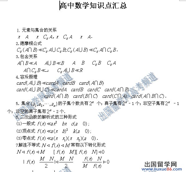 出國(guó)留學(xué)網(wǎng)高考頻道為您精心提供高中數(shù)學(xué)知識(shí)點(diǎn)匯總,點(diǎn)擊下面的鏈接下載word版完整版,你們不用太感謝小編,請(qǐng)教小編雷鋒!小編愿意做一顆小小的螺絲釘,為大家的高考默默的貢獻(xiàn)自己的力量!淚崩~~~~