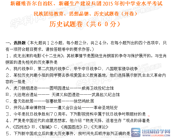 點擊下載>>2015年新疆中考歷史試題及答案