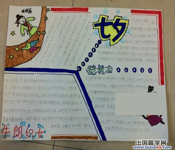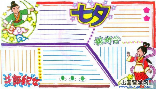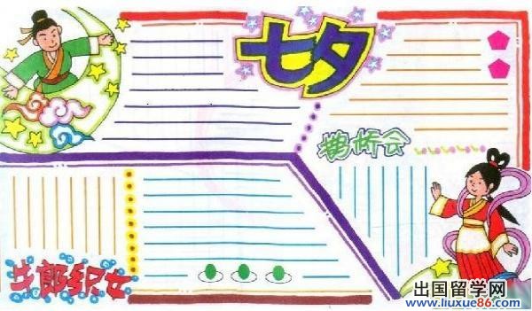 關(guān)于七夕的手抄報-牛郎織女,這是一個很美麗的,千古流傳的愛情故事,成為我國四大民間愛情傳說之一。傳說天上有個織女星,還有一個牽牛星??椗蜖颗G橥兑夂希男南嘤???墒?,天條律令是不允許男歡女愛、私自相戀的??椗峭跄傅膶O女,王母便將牽牛貶下凡塵了,令織女不停地織云錦以作懲罰。歡迎來到出國留學網(wǎng),以下是手抄報欄目小編特意為您整理提供的《七夕手抄報》資料,如有需要,請參考!如果喜歡,請繼續(xù)關(guān)注我們。