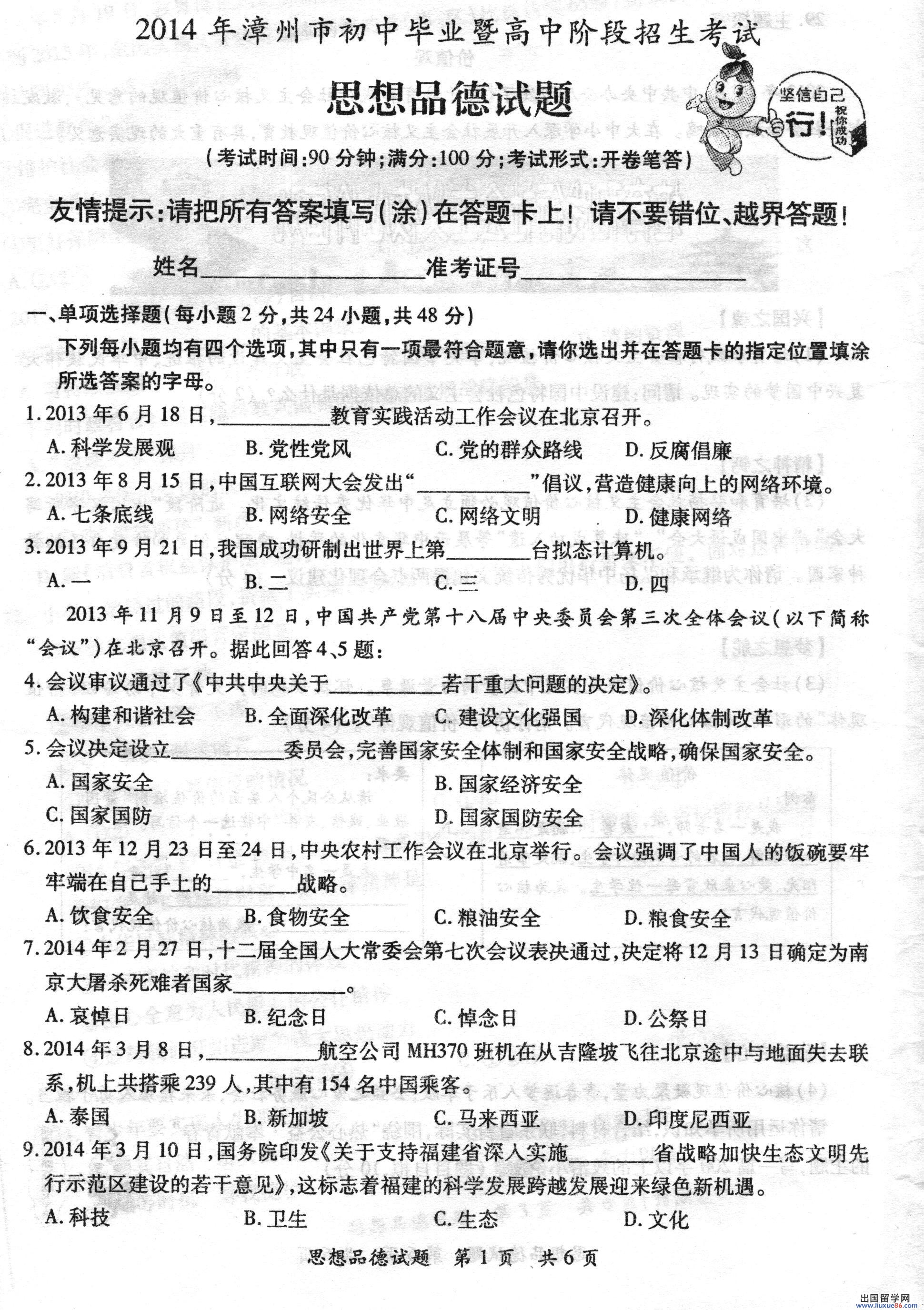 以下2014年福建中考政治真題及答案由出國留學(xué)網(wǎng)中考頻道為您提供,希望對您有所幫助!