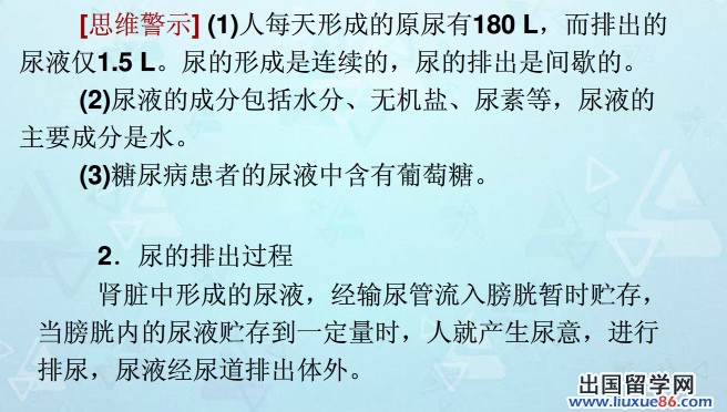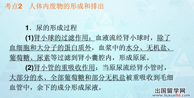 同學們復習《人體內(nèi)廢物的形成和排出》時要注意重難點:重點:1.腎臟的結構 2.尿液形成的過程。難點:1、腎單位的結構與尿液形成的關系; 2.尿液形成過程中的物質(zhì)變化。更多有關2014中考生物的信息可登錄出國留學網(wǎng)生物頻道,歡迎收藏本站(CTRL+D即可收藏)!