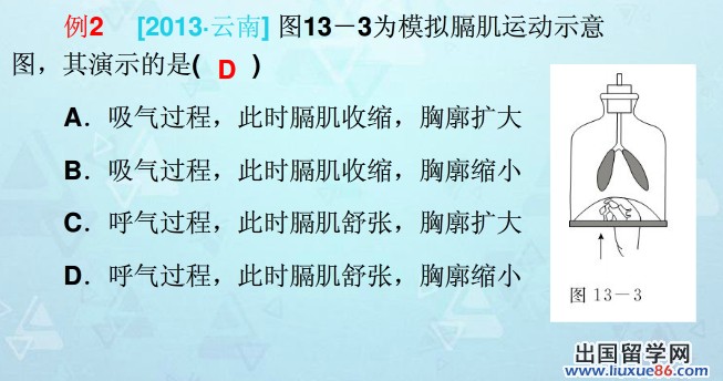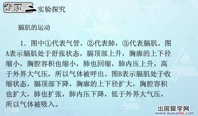 同學(xué)們復(fù)習(xí)《膈肌的運(yùn)動(dòng)》時(shí)要注意重難點(diǎn):1.描述人體呼吸系統(tǒng)的組成。2.概述呼吸道和肺的結(jié)構(gòu)與功能相適應(yīng)的特點(diǎn)。3.概述呼吸運(yùn)動(dòng)的過(guò)程。更多有關(guān)2014中考生物的信息可登錄出國(guó)留學(xué)網(wǎng)生物頻道,歡迎收藏本站(CTRL+D即可收藏)!