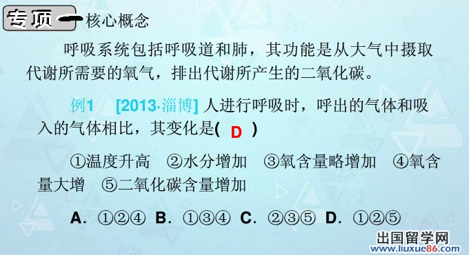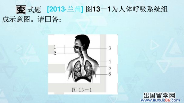 同學(xué)們復(fù)習(xí)《人體的呼吸》時(shí)要注意重難點(diǎn):1.知道人體的呼吸系統(tǒng)的組成。能說出呼吸道作用。2具備通過探究法、資料分析等獲取知識的能力。3.認(rèn)同呼吸道對空氣處理能力是有限的。4.體驗(yàn)“食不言”,養(yǎng)成“食不言”的好習(xí)慣。更多有關(guān)2014中考生物的信息可登錄出國留學(xué)網(wǎng)生物頻道,歡迎收藏本站(CTRL+D即可收藏)!