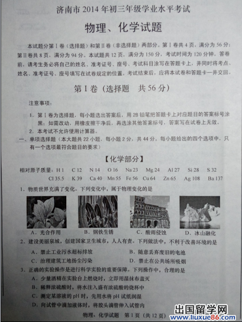 以下2014年濟(jì)南中考化學(xué)真題及答案由出國留學(xué)網(wǎng)中考頻道為您提供,希望對您有所幫助!