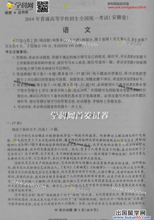 2014年的高考正在進(jìn)行,相信此時的考生們正在考場里揮灑文墨,正懷抱著雄心壯志。出國留學(xué)網(wǎng)高考頻道會及時為廣大考生提供2014年安徽高考語文真題及答案,考生們在考試的時候先不用查探,應(yīng)該將主要注意力放在下一場考試上,等所有的考試結(jié)束,考生們再上來本頁面進(jìn)行刷新核對考卷答案,預(yù)估出自己的分?jǐn)?shù)。刷新請按ctrl+F5,出國留學(xué)網(wǎng)高考頻道現(xiàn)在這里預(yù)祝大家考出自己滿意的成績。
