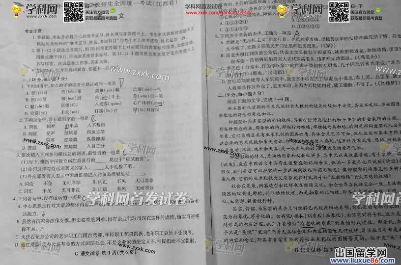 高考考生的心態(tài)起伏是很大的,往往第一場(chǎng)考得不是很理想會(huì)影響接下來(lái)的考試,小編提醒各位一定要理性的看待高考,高考的成績(jī)也不是僅憑第一門來(lái)決定的,出國(guó)留學(xué)網(wǎng)高考頻道屆時(shí)將為大家呈現(xiàn)2014江西高考語(yǔ)文真題及答案,敬請(qǐng)各位考生和家長(zhǎng)隨時(shí)關(guān)注!