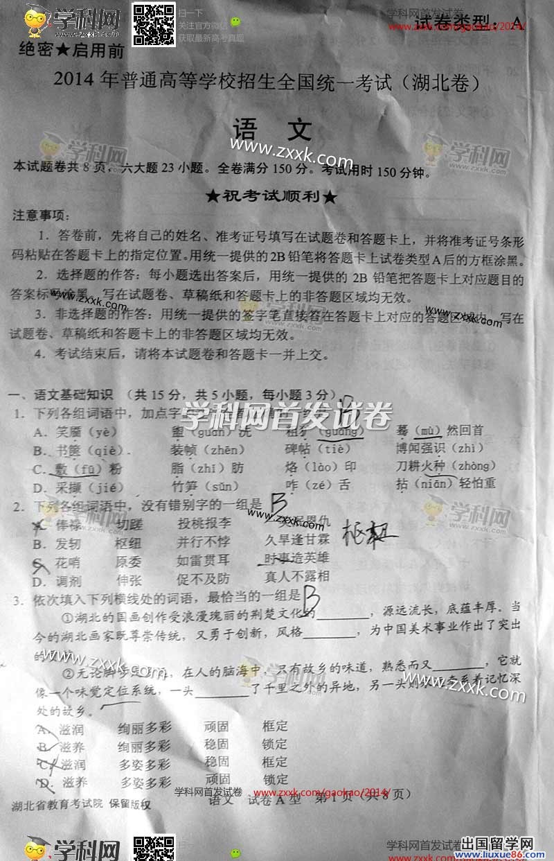 十年寒窗,在此一搏!高考即將來臨,一次決定成敗的挑戰(zhàn)即將開始。無論你現在是成竹在胸,還是茫無頭緒,不知所措,你都不能退縮。今年的湖北高考真題將在考后公布,出國留學網高考頻道小編將緊密關注2014年湖北語文真題最新發(fā)布,在此頁面將及時公布,請學子們及家長密切關注本頁面。如果真題及答案沒有顯示,那么請按Ctrl+F5刷新。為了能及時知曉2014湖北高考xx真題及答案,建議大家按Ctrl+D收藏我們網站!