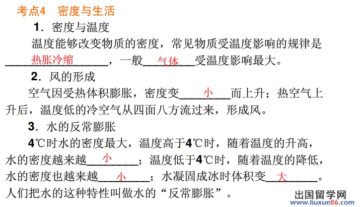 同學(xué)們復(fù)習(xí)《密度與生活》時要注意重難點:1、了解密度在社會生活中的重要價值;2、知道物質(zhì)的密度隨溫度的變化而變化的現(xiàn)象;3、理解和掌握用測定密度來鑒別物質(zhì)的方法,每種物質(zhì)都有自己的密度,不同物質(zhì)的密度有可能相同;4、能靈活運用ρ=m/V及其兩個變形式。更多有關(guān)2014中考物理的信息可登錄出國留學(xué)網(wǎng)物理頻道,歡迎收藏本站(CTRL+D即可收藏)!