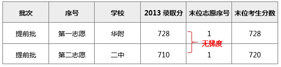 這個(gè)是典型的無梯度志愿。雖然二中和華附有18分的分差,但我們從末位志愿序號(hào)看到二中在第一志愿就已經(jīng)錄滿,如果第一志愿沒有被華附錄取,第二志愿也不可能被二中錄取。所以這個(gè)是無梯度的志愿。