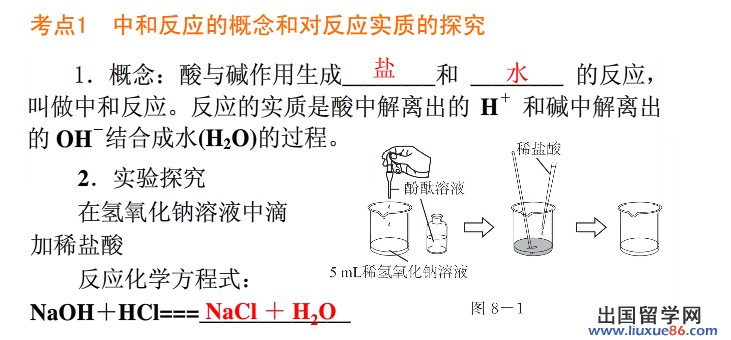 同學(xué)們復(fù)習(xí)《中和反應(yīng)的概念》時(shí)要注意重難點(diǎn):【重點(diǎn)】酸堿之間的中和反應(yīng)及其應(yīng)用?!倦y點(diǎn)】中和反應(yīng)的探究過程,以及對中和反應(yīng)實(shí)質(zhì)的理解。更多有關(guān)2014中考化學(xué)的信息可登錄出國留學(xué)網(wǎng)化學(xué)頻道,歡迎收藏本站(CTRL+D即可收藏)!