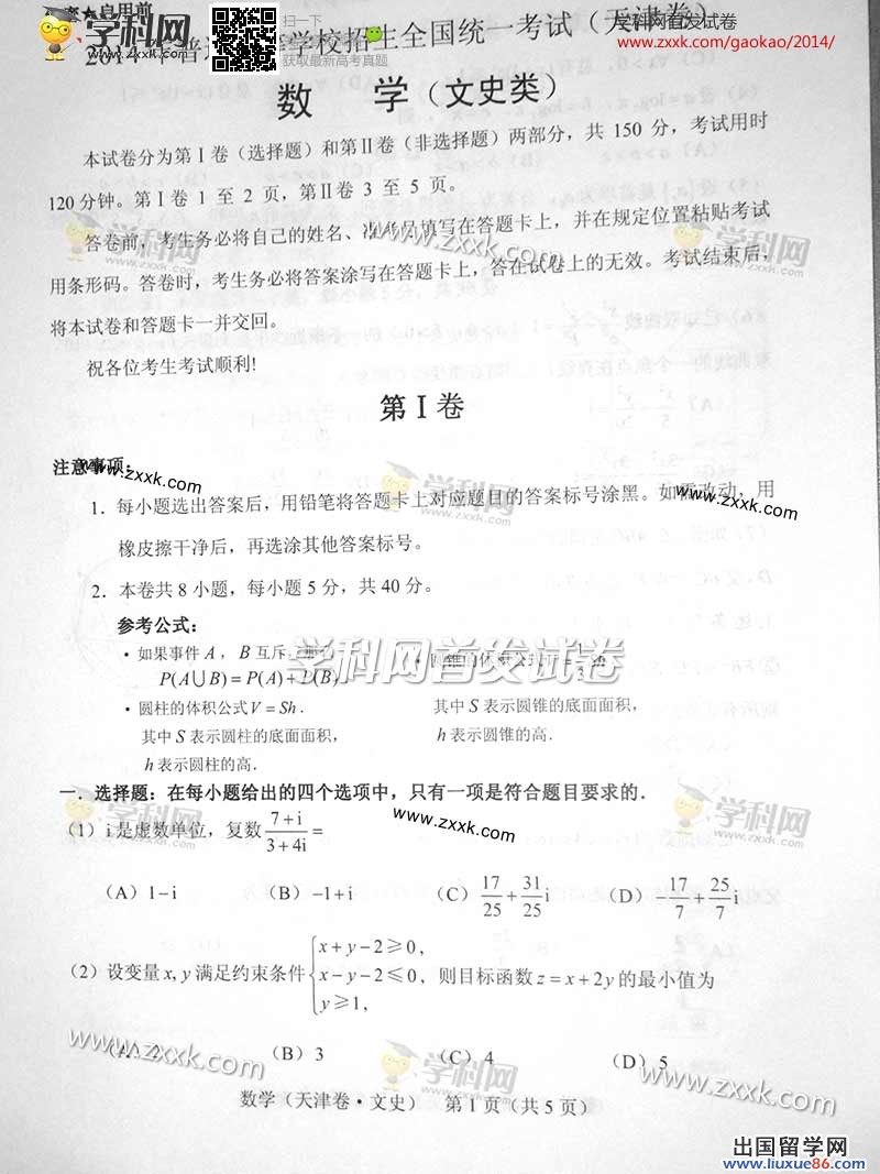 伴隨著考場(chǎng)鈴聲的響起,2014高考的xx考試終于落下帷幕,出國(guó)留學(xué)網(wǎng)高考頻道第一時(shí)間為大家發(fā)布2014天津高考文科數(shù)學(xué)真題及答案,與各位網(wǎng)友共享,希望對(duì)大家有所幫助,更多精彩內(nèi)容,請(qǐng)?jiān)L問(wèn)高考頻道。