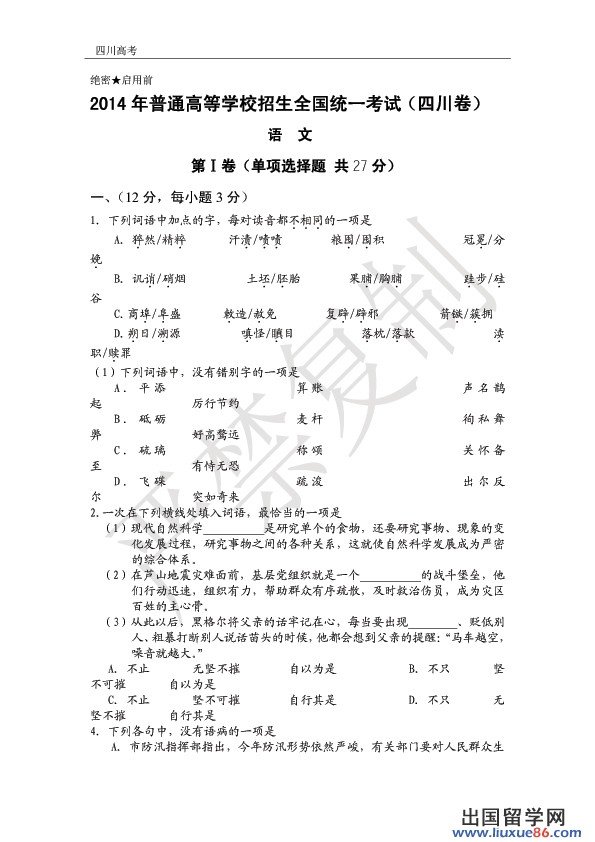 不要著急、不要心慌;要腳踏實(shí)地,查缺補(bǔ)漏,穩(wěn)扎穩(wěn)打;一年一度的高考即將落下帷幕,過去都不重要了,要保持良好而穩(wěn)定的心態(tài),抵住壓力,耐得住寂寞……堅(jiān)持到最后,你就是勝利者!出國(guó)留學(xué)網(wǎng)四川高考頻道考后為您首發(fā)2014四川高考語文試題,并為您附上答案解析,一旦高考真題及答案發(fā)布,將在此表頁(yè)的頭條顯示,請(qǐng)按crtl+F5進(jìn)行刷新。