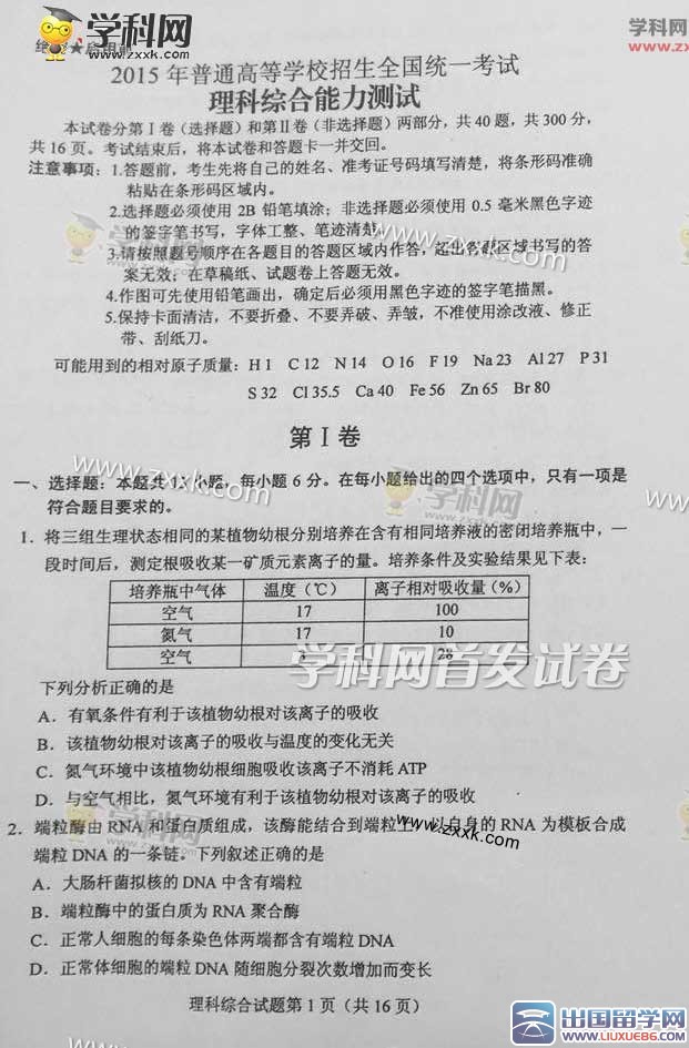 在充滿激情、充滿希望的六月,高考開始了。出國留學網(wǎng)高考頻道第一時間為您提供2015青海高考理綜真題及答案解析,方便所有考生更了解高考動向,了解自己的考試成績。