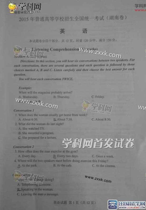 十年寒窗苦讀, 只為金榜題名時。高考,是每個人的重要人生轉(zhuǎn)折點(diǎn),是青春的祭奠,也是未來生活的基石。距離2015年湖南高考還有一天,出國留學(xué)網(wǎng)高考頻道小編緊密關(guān)注2015年湖南高考英語真題及答案,將把最新高考真題及答案相關(guān)動態(tài)第一時間在此頁面顯示,請廣大考生和家長注意留心查看。為方便建議可將本頁面收藏。