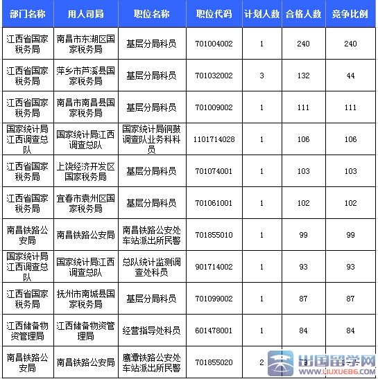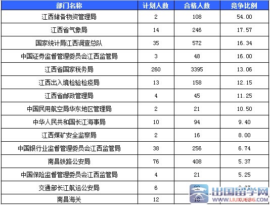 為幫助廣大考生更清晰的了解今日報名情況,出國留學網(wǎng)整理了此次招錄江西15個部門的報考情況,供廣大考生參考: