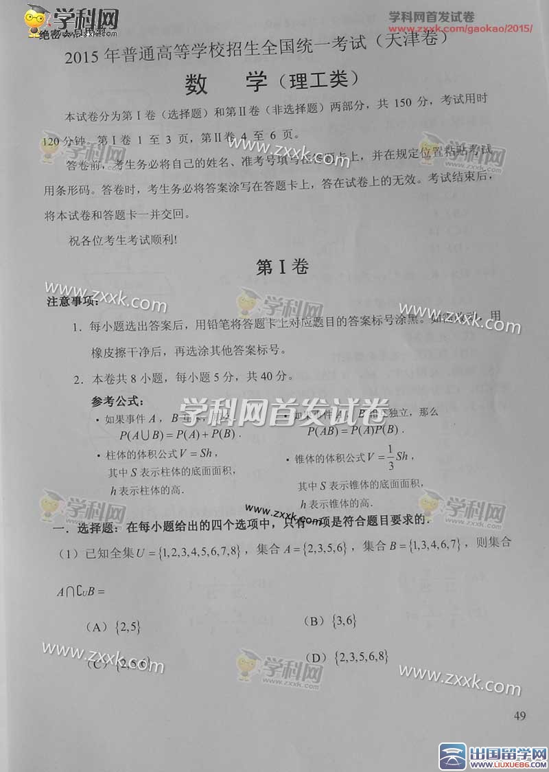 小編在此提醒各位,考試時(shí)如果遇到不會(huì)的題目千萬不要慌張,要沉著應(yīng)對,跳過去或者做自己會(huì)做的題,高考,如果你能把自己會(huì)做的題全部做對,成績也不會(huì)太差。另外我們出國留學(xué)網(wǎng)高考頻道會(huì)及時(shí)為廣大考生提供2015年天津高考理數(shù)真題及答案,同時(shí)接下來的幾個(gè)科目真題及答案亦會(huì)在此頻道顯示,請考試及家長關(guān)注本站更新(ctrl+D收藏即可)。一旦2015天津高考真題及答案發(fā)布,將在此表頁的頭條顯示,如果您需要查找的真題及答案沒有顯示,請按ctrl+F5進(jìn)行刷新。