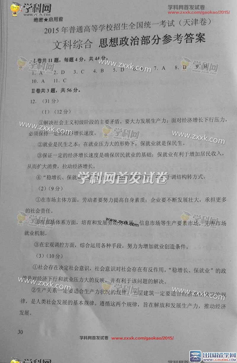 高考網(wǎng)是專注于高考方方面面的專業(yè)網(wǎng)站,本網(wǎng)站在2015天津高考結(jié)束后,以最快的速度把 2015天津高考文綜真題及答案呈現(xiàn)出來, 一旦高考真題及答案發(fā)布,將在此表頁的頭條顯示,如果您需要查找的真題及答案沒有顯示,請按ctrl+F5進(jìn)行 刷新。希望對大家有所幫助。