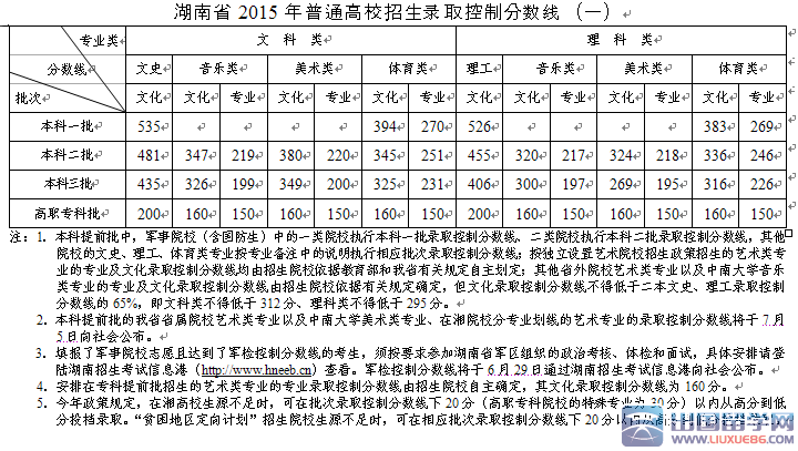 出國留學(xué)網(wǎng)高考分?jǐn)?shù)線頻道訊:2015年湖南高考二本分?jǐn)?shù)線:理455分