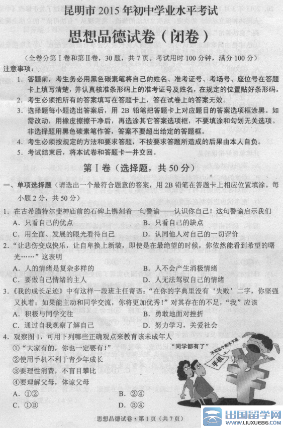 希望,只有和勤奮作伴,才能如虎添翼。出國留學(xué)網(wǎng)中考頻道的小編會(huì)及時(shí)為廣大考生提供:2015年云南昆明中考政治試題及答案,有需要的考生可以在考題公布后刷新本頁面(按ctrl+F5),希望對(duì)大家有所幫助。