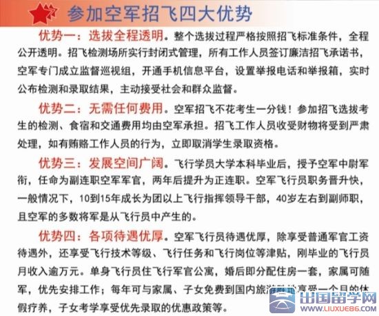 出國留學(xué)高考網(wǎng)為大家提供參加空軍招飛的四大優(yōu)勢,更多高考資訊請關(guān)注我們網(wǎng)站的更新!