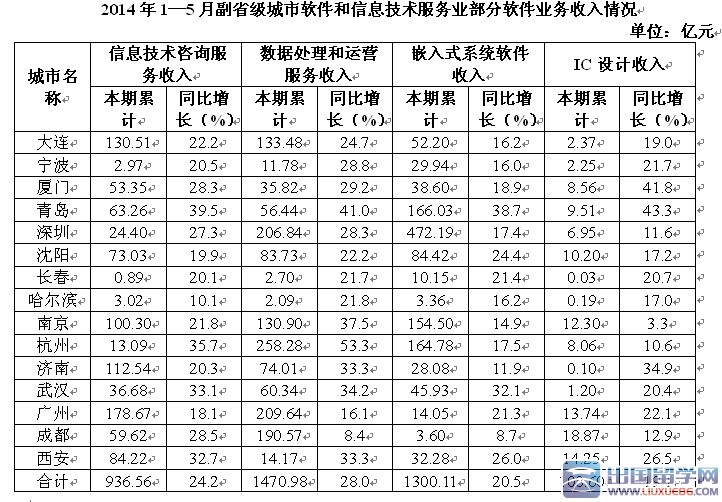 2014年1-5月,我國軟件和信息技術(shù)服務(wù)業(yè)實(shí)現(xiàn)軟件業(yè)務(wù)收入約13254億元,同比增長20.9%,比去年同期回落3.3個(gè)百分點(diǎn)。其中,軟件產(chǎn)品完成收入4141億元,信息系統(tǒng)集成服務(wù)完成收入2649.3億元,信息技術(shù)咨詢服務(wù)完成收入1399.2億元。數(shù)據(jù)處理和運(yùn)營服務(wù)完成收入2429.5億元。嵌入式系統(tǒng)軟件完成收入2230.3億元。IC設(shè)計(jì)完成收入405.1億元。