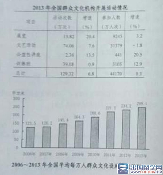 A.2013年文藝活動的參加人數(shù)約是公益性講座的50倍