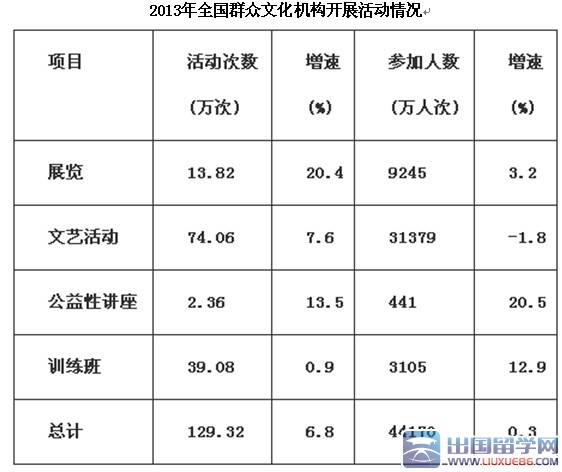 2013年末全國共有群眾文化機(jī)構(gòu)44260個(gè)。比上年末增加384個(gè),其中鄉(xiāng)鎮(zhèn)文化站34343個(gè),增加242個(gè)。年末群眾文化機(jī)構(gòu)從業(yè)人員164355人,比上年末增加8127人,群眾文化機(jī)構(gòu)實(shí)際使用房屋建筑面積3389.4萬平方米。比上年末增長6.9%,年末群眾文化機(jī)構(gòu)共有館辦文藝團(tuán)體6022個(gè),演出15.13萬場,觀眾6569萬人次。