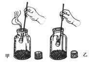 實驗示意圖:甲、乙兩個玻璃瓶中分別裝有等量的萌發(fā)種子和煮熟后冷卻至室溫的種子,加蓋并在溫暖的地方放置一夜后,將燃燒的蠟燭放入甲、乙兩瓶中,觀察燃燒情況。
