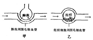 (1)經(jīng)過氣體交換,圖甲中血液變化是___________ 血變?yōu)橐谎?BR>    (2)在血液循環(huán)途徑中,圖甲所處的是什么循環(huán)?圖乙所處的是什么循環(huán)?