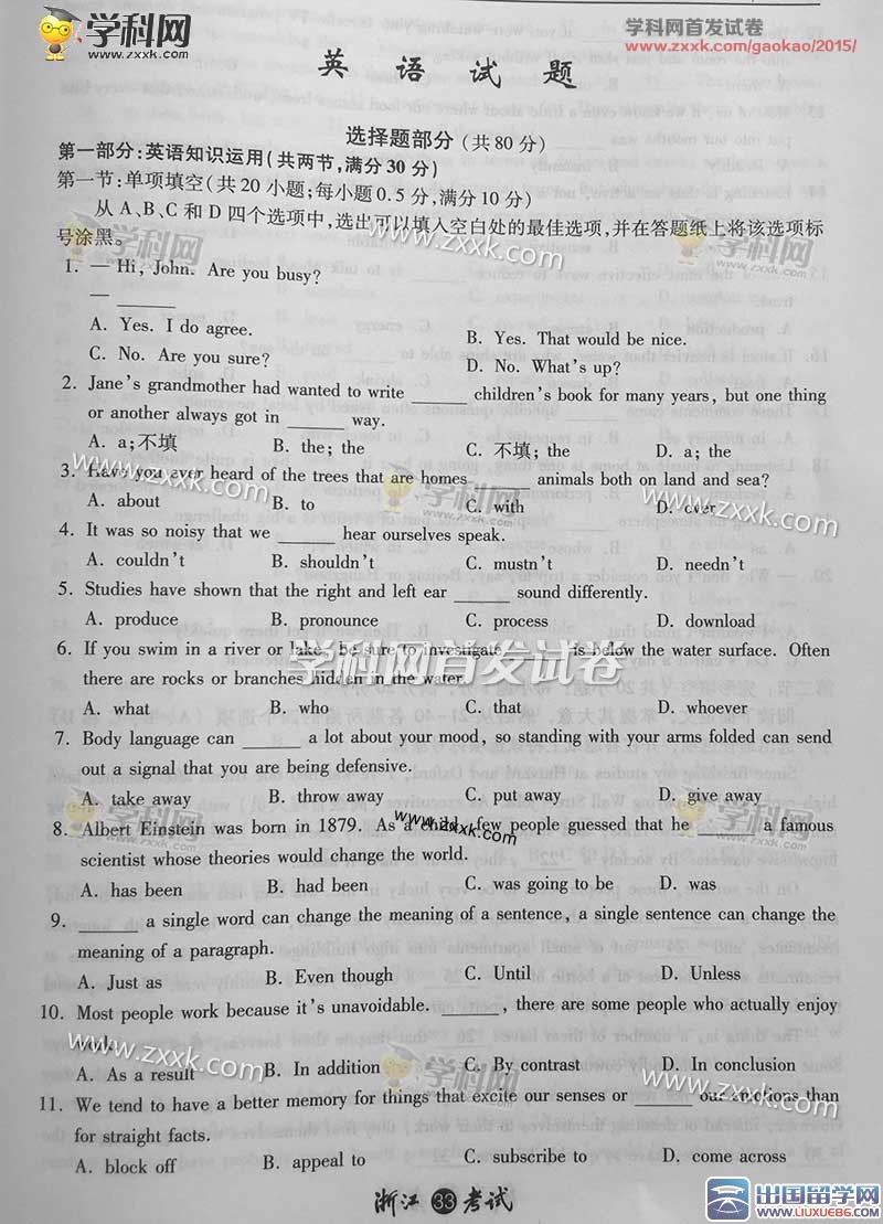 經(jīng)歷了12年的學(xué)習(xí)和積累,現(xiàn)在終于到了同學(xué)們展示成果的時(shí)候了,高考正在進(jìn)行,相信同學(xué)們都已經(jīng)準(zhǔn)備好了,為了給您提供方便,出國留學(xué)網(wǎng)高考頻道會及時(shí)為廣大考生提供2015年浙江高考英語真題及答案,請您持續(xù)關(guān)注出國留學(xué)網(wǎng)高考頻道,我們會為您不間斷的更新信息,同時(shí)我們也預(yù)祝您取得好成績。