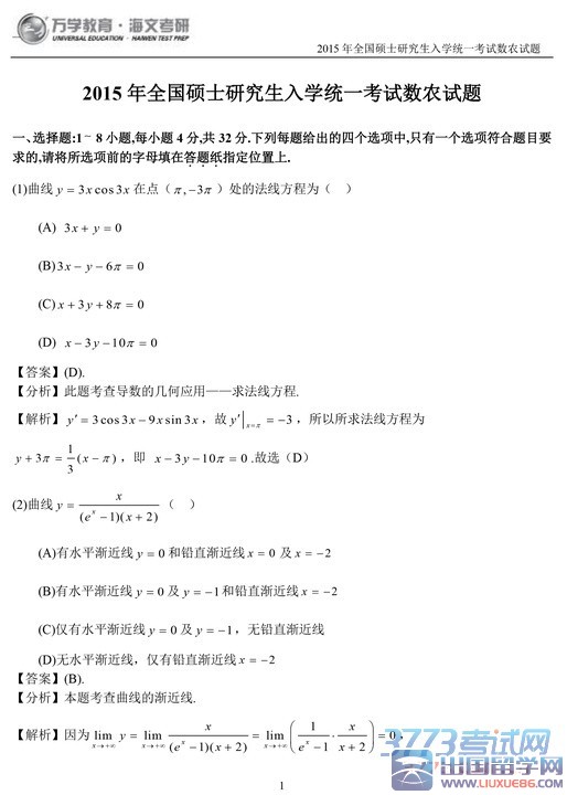 2015年的考研大戰(zhàn)已經(jīng)結(jié)束了,出國(guó)留學(xué)網(wǎng)考研數(shù)農(nóng)頻道小編在考后第一時(shí)間為大家提供2015年考研數(shù)農(nóng)真題及答案,歡迎大家參考和借鑒,大家可以按ctrl+D收藏我們的網(wǎng)站,了解更多最新的考研信息!