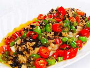 8. 起鍋,鍋中倒入少許初榨橄欖油,放入青紅杭椒圈煸香,放步驟(6)的料另一半煸透,加美極醬油調味,煸炒,淋少許水炒香倒出,淋在蒸好的千葉豆腐之上即可。