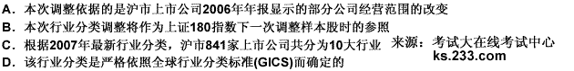 2、關(guān)于上海證券交易所與中證指數(shù)有限公司于2007年5月31日公布的調(diào)整后的滬市上市公司行業(yè)分類(lèi),下列說(shuō)法正確的是( ?。?BR>