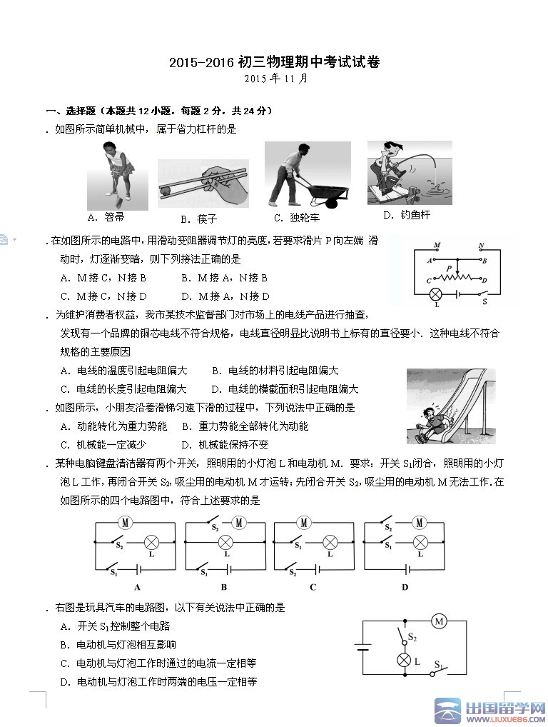 出國留學(xué)中考網(wǎng)為大家提供南京初三物理期中考試試題及答案(2015?2016),更多中考物理試題及答案請關(guān)注我們網(wǎng)站的更新!
