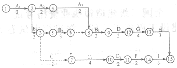 某承包商根據(jù)工作項的緊前工作、緊后工作之間的邏輯關系以及持續(xù)工作時間做出了如下雙代號網(wǎng)絡計劃: