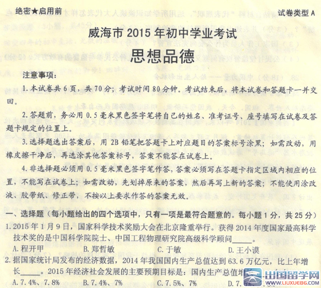 懦弱的人只會(huì)裹足不前,莽撞的人只能引為燒身,只有真正勇敢的人才能所向披靡。出國(guó)留學(xué)網(wǎng)中考頻道的小編會(huì)及時(shí)為廣大考生提 供:2015年山東威海中考政治試題及答案 ,有需要的考生可以在考題公布后刷新本頁(yè)面(按ctrl+F5),希望對(duì)大家有所幫助。